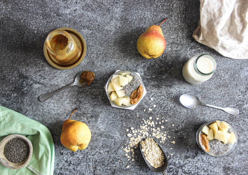 Parfait caramel, poire, flocons d’avoine et graines de chia overnight
