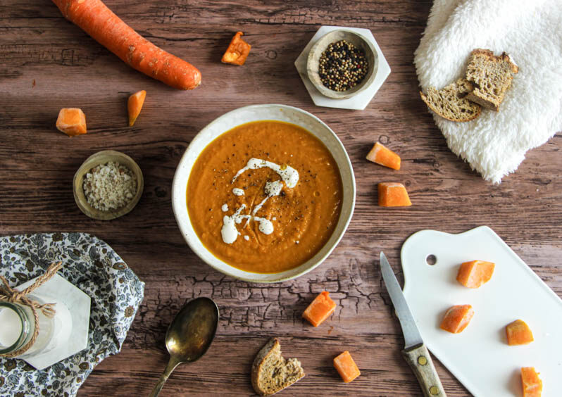 Soupe de carottes, potimarron et lait d’amande