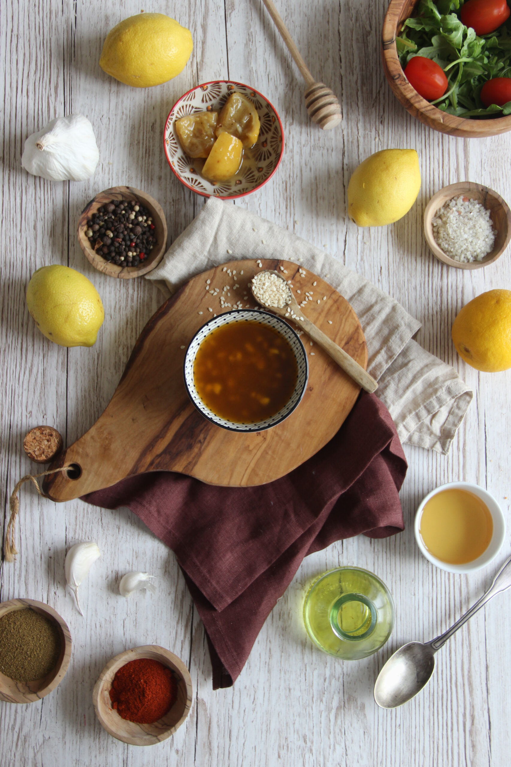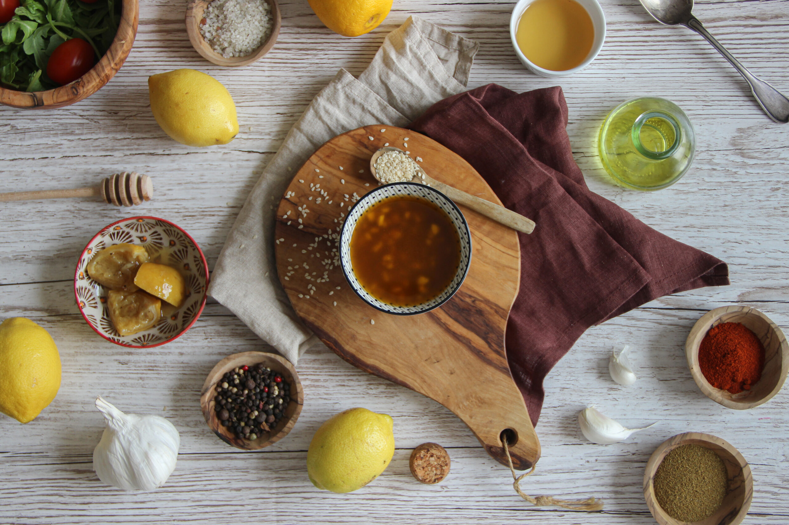 - Dans un bocal, mettez les écorces de citrons confits, l'huile d'olive, le vinaigre de cidre, l'ail émincé, le miel, le cumin moulu et le paprika.