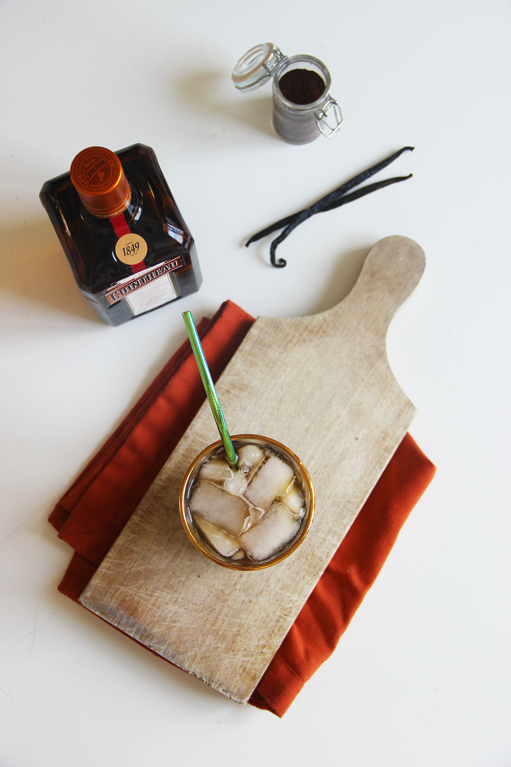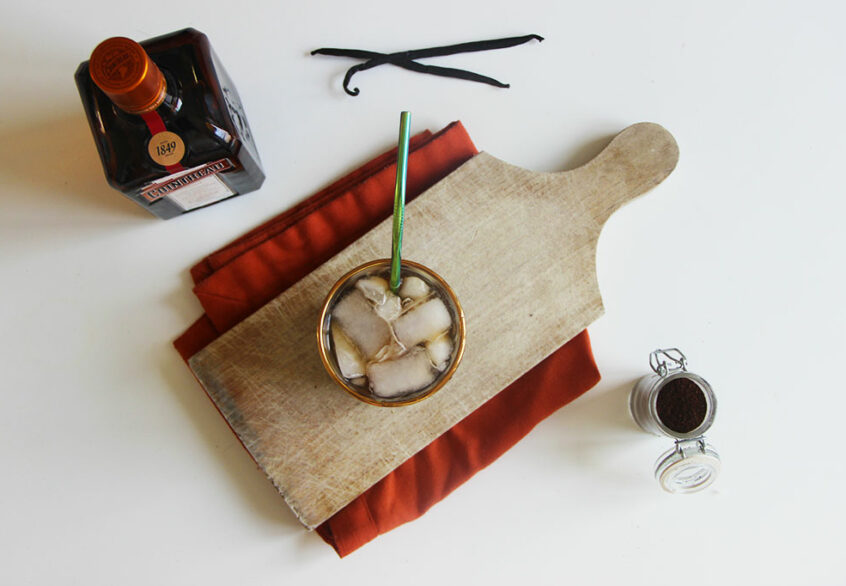 Associer le bourbon au café froid m’a semblé naturel. Les notes vanillées et caramélisées prolongent celles du café, surtout si le café choisi est rond et peu acide. Mais il manquait encore une étincelle pour réveiller l’ensemble : c’est là que l’orange, via le Cointreau, intervient. L’orange et le café peuvent surprendre, mais fonctionnent très bien ensemble. Dans certaines pâtisseries italiennes ou françaises, ce duo apparaît déjà, souvent sous forme de chocolat à l’orange accompagné d’un café. L’agrume apporte fraîcheur et légère amertume, tandis que le Cointreau, avec ses écorces d’oranges douces et amères, apporte une touche aromatique sans alourdir. Créé au XIXᵉ siècle à Angers, il est devenu un classique des cocktails. Utiliser un alcool à base d’écorces d’orange, surtout en hiver quand les fruits sont les plus parfumés, est une façon subtile de prolonger la saison dans le verre. La vanille complète l’ensemble. Le sirop de vanille n’est pas là pour transformer le cocktail en dessert, mais pour arrondir les saveurs.