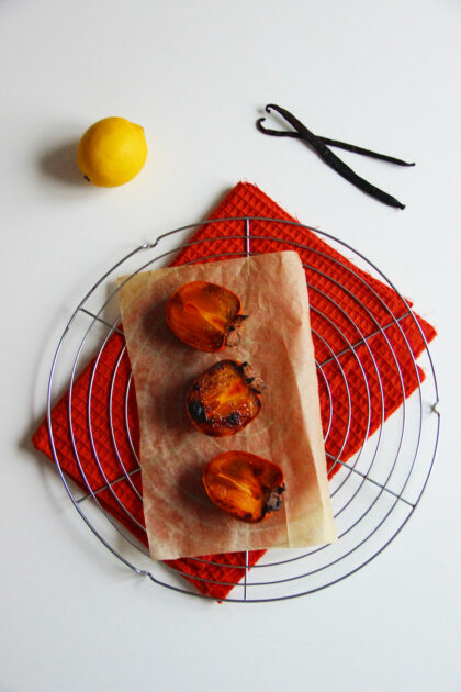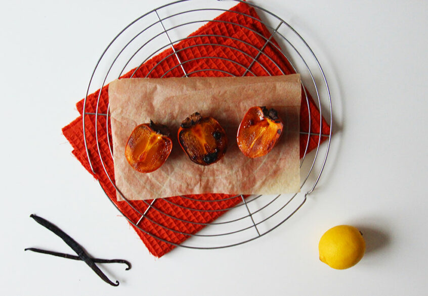 J’aime particulièrement cuisiner les fruits bien mûrs. Quand on les cuit, leur sucre naturel se concentre et leurs arômes se révèlent. Les kakis, en particulier, deviennent crémeux, presque confits. C’est un geste simple anti-gaspillage, qui transforme un fruit trop mûr en dessert, sans besoin d’ingrédients rares ou de longues préparations. Quelques minutes au four suffisent pour obtenir une chair fondante et caramélisée. J’aime y ajouter un peu de vanille ou de rhum pour parfumer, parfois une pincée de cannelle, mais même nature, c’est délicieux.