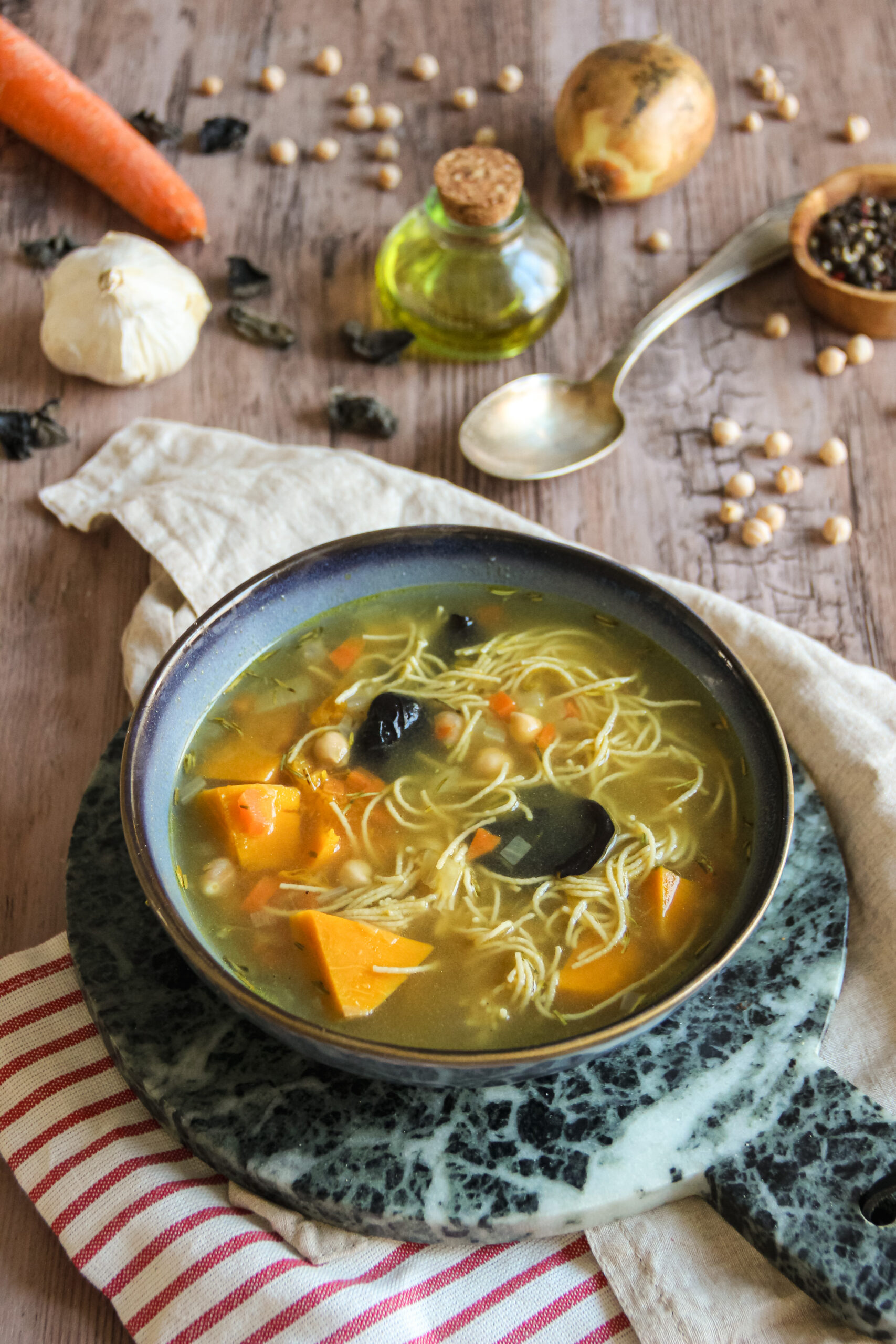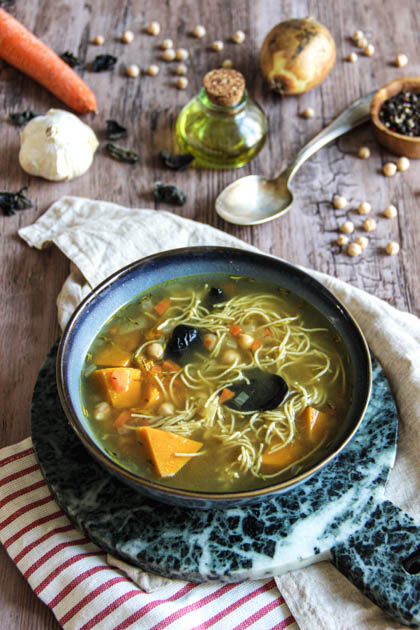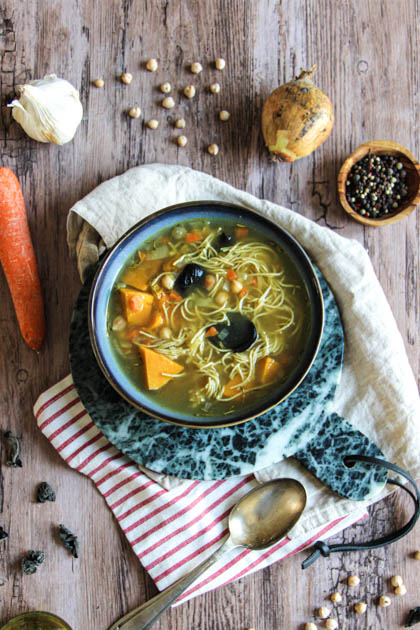 Je vous partage aujourd’hui une recette simple mais qui m’a rappelé mon enfance : un ragoût de pois chiches et courge façon minestrone. Je l’ai imaginé un soir pour finir un reste de nouilles et quelques légumes qui traînaient dans mon frigo. Ces soirs où l’on ouvre le frigo et qu’il ne reste pas grand‑chose, mais où l’on a quand même envie de se faire un plat nourrissant et réconfortant, je suis sûre que vous voyez ce que je veux dire.