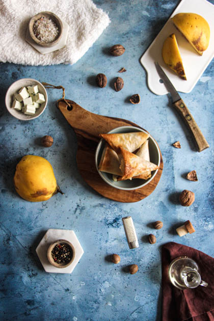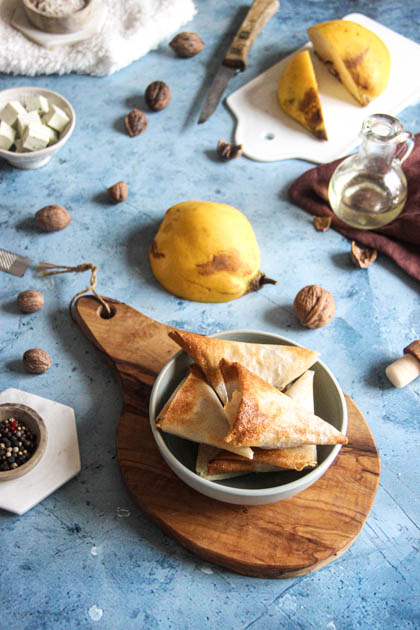 Quand j’ai repéré cette recette de samossas au coing et au bleu sur le blog Marmotte cuisine, je me suis tout de suite dit qu’il fallait que je la mette de côté. D’abord parce que j’aime beaucoup l’idée de revisiter des saveurs classiques en petites bouchées croustillantes, mais aussi parce que le coing est un fruit que je veux cuisiner plus. Soyons honnête : qui pense spontanément à utiliser le coing dans une recette salée, à part dans certains tajines ou plats orientaux ? Ici, le contraste entre la douceur légèrement acidulée du coing et le caractère du bleu m’a intriguée, alors j’ai eu envie de tester.