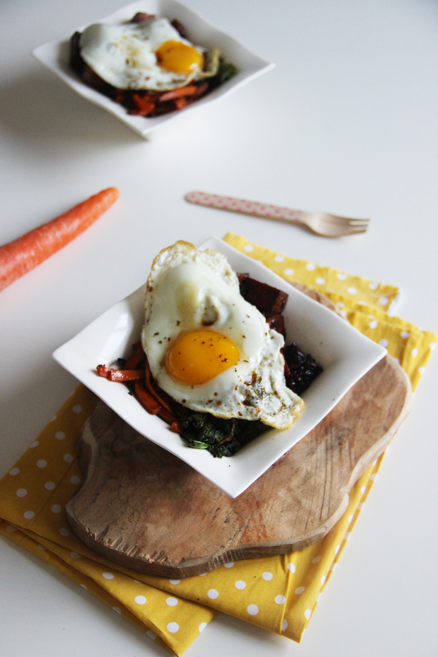 - Dressez le riz dans un bol, ajoutez le mélange tofu-légumes par-dessus, puis déposez l’œuf. Terminez avec un filet de sauce soja.