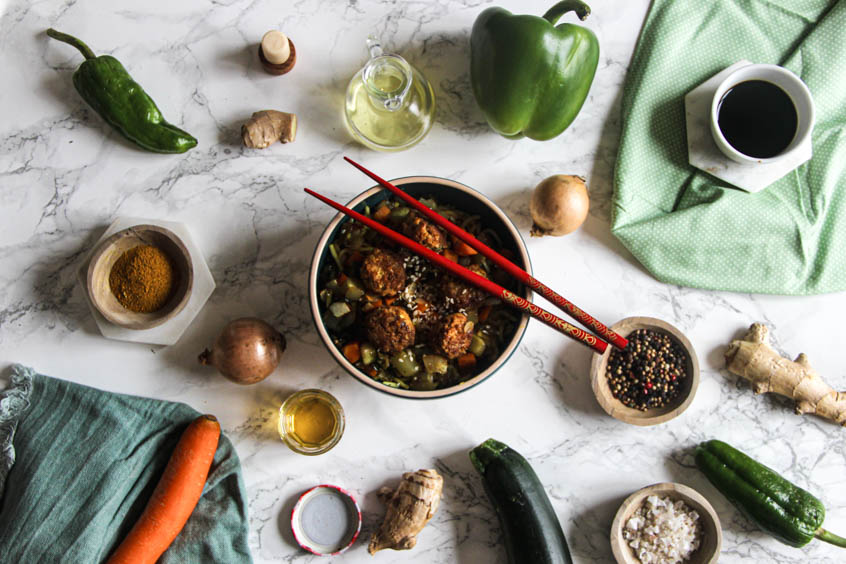 En préparant ce plat, j’ai eu l’occasion d’utiliser un ingrédient que j’utilise peu : les boulettes végétales industrielles. Je sais que certaines personnes peuvent hésiter à acheter des produits déjà préparés, pensant qu’ils sont moins “sains” ou “authentiques”. Pourtant, ces boulettes toutes prêtes sont souvent enrichies en protéines et contiennent des légumineuses, du tofu ou des céréales complètes. Elles permettent de gagner un temps précieux et s’intègrent parfaitement dans un plat maison.