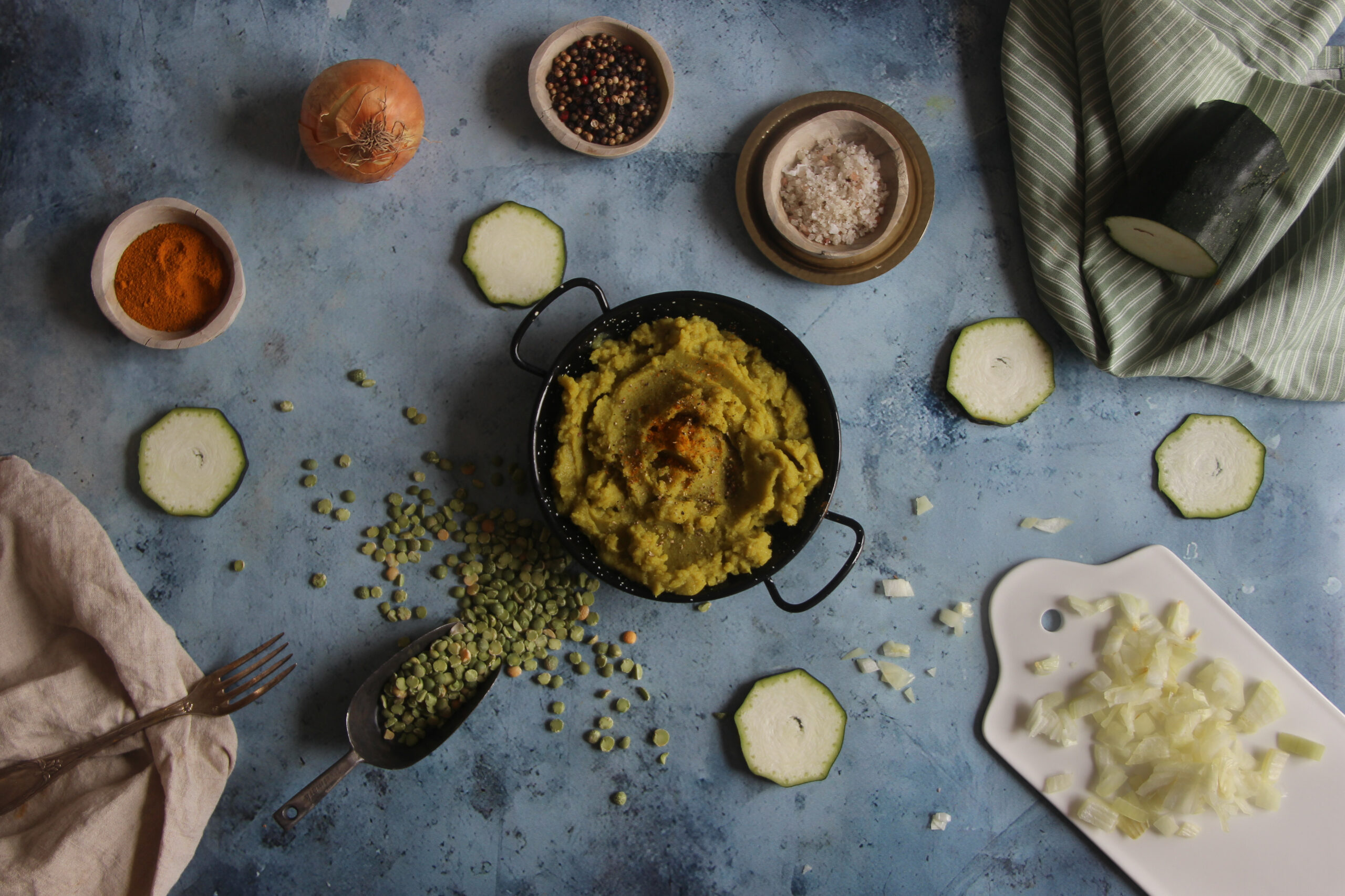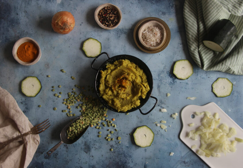 Pour cette recette, j’ai associé les pois cassés à la courgette, un légume très courant mais utile pour la texture. La courgette a un goût doux qui laisse la place aux pois cassés tout en ajoutant de l’onctuosité. Je sais que certaines personnes préfèrent les purées complètement lisses, mais moi, j’aime sentir un peu de matière sous la cuillère, ça donne un côté plus consistant et vrai, sans complication. La courgette est arrivée assez tard en Europe, venant d’Amérique centrale, et elle s’est imposée pour sa polyvalence et sa facilité de culture. Elle contient beaucoup d’eau et de vitamines, ce qui équilibre bien les légumineuses plus denses.
