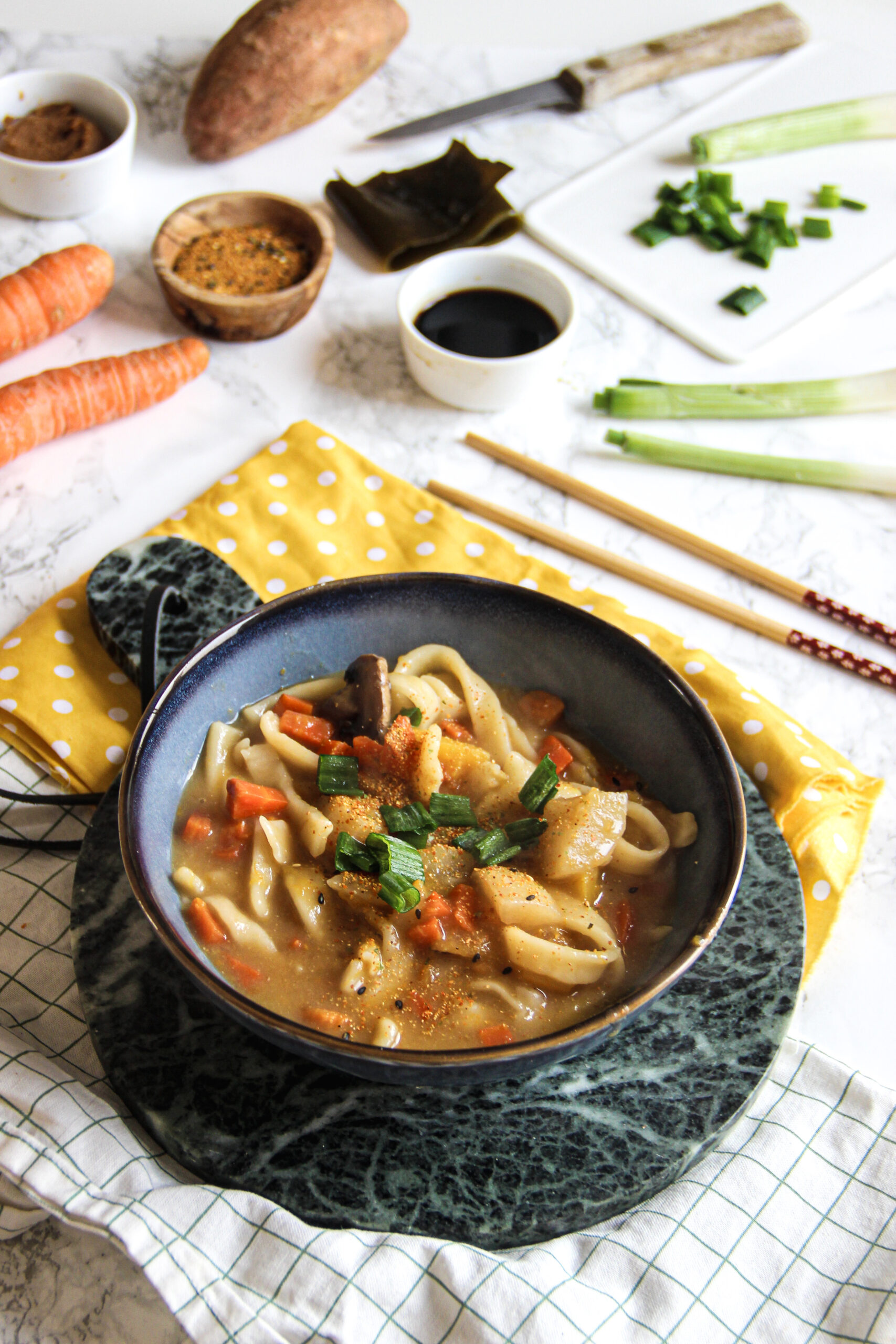 - Servez dans deux bols et garnissez d'oignon vert et de shishimi togarashi.