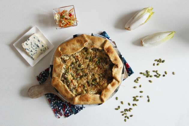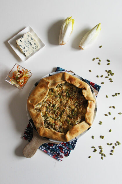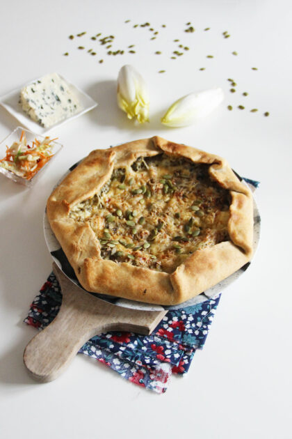Pour le fromage, j’utilise généralement du roquefort ou un autre bleu de caractère. Ce qui est top avec cette tarte, c’est que le bleu ressort vraiment bien sans dominer complètement le plat. Il apporte une note crémeuse et légèrement piquante qui se marie parfaitement avec la douceur des endives, surtout lorsqu’elles sont légèrement caramélisées grâce à un peu de sucre ajouté pendant la cuisson. Et si vous n’êtes pas très fan de bleu, il est possible d’en réduire la quantité ou de choisir un fromage persillé plus doux, mais pour moi, c’est le roquefort qui donne toute sa personnalité à cette tarte. J’ajoute souvent quelques graines de courge à la fin, ce qui apporte une petite touche croquante et un contraste agréable, tout en ajoutant un bonus nutritionnel avec leur apport en magnésium et en fer.