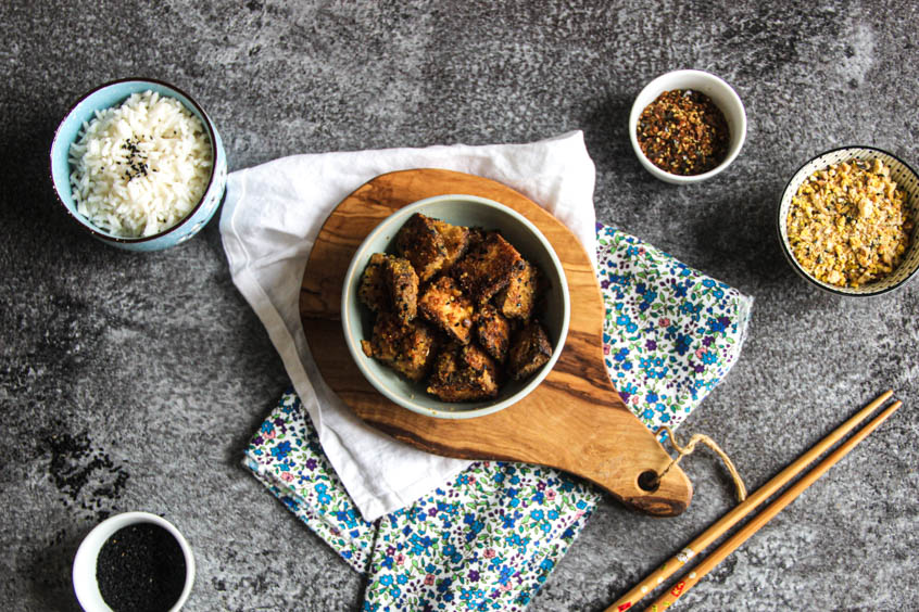L’un des ingrédients qui intrigue le plus dans cette recette, ce sont les algues, sous forme de furikake ou de feuilles de nori émiettées. Ils apportent un léger goût iodé, légèrement grillé, qui relève vraiment le tofu. Associé aux graines de sésame, l’ensemble est très équilibré.