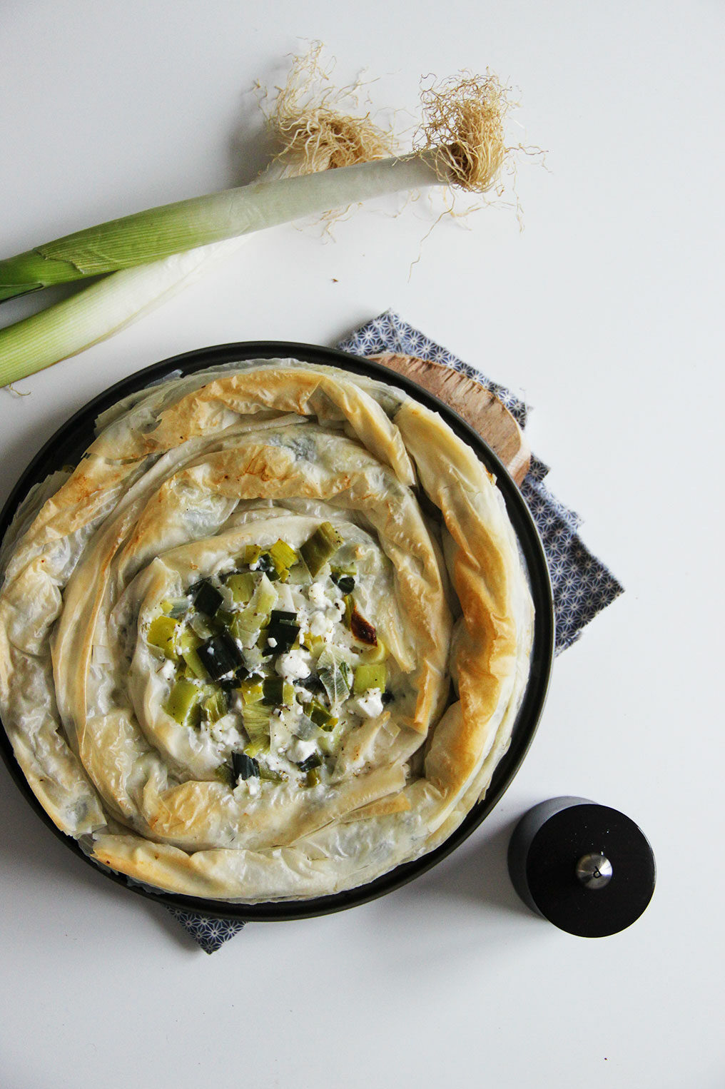 Pour cette version, j’ai choisi des poireaux, un légume de saison parfait pour l’hiver. Le poireau fait partie de la famille des alliacées, comme l’oignon et l’ail, mais il est beaucoup plus doux. Il est très apprécié dans la cuisine française, notamment dans la soupe poireaux-pommes de terre ou la fondue de poireaux, mais aussi dans la cuisine des Balkans. Le poireau est riche en fibres, vitamines et minéraux, et il est reconnu pour ses vertus digestives et pour le cœur. C’est amusant de savoir qu’en Égypte ancienne, les soldats en consommaient pour avoir de la force, et que même les Romains l’appréciaient pour ses qualités nutritionnelles. Pour moi, l’idée d’utiliser un légume simple mais nutritif dans un plat festif comme le zelnik, c’est exactement ce que j’aime : accessible, sain et savoureux.