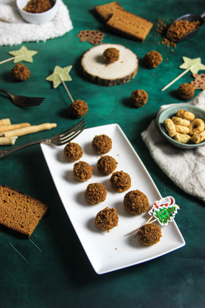 - Mélangez le faux gras en dés avec 50 g de pain d'épices mixé, puis formez des boules et roulez-les dans le pain d'épices restant.