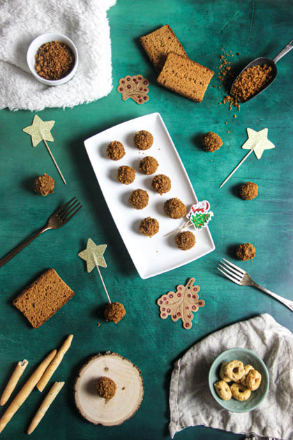 - Mélangez le faux gras en dés avec 50 g de pain d'épices mixé, puis formez des boules et roulez-les dans le pain d'épices restant.