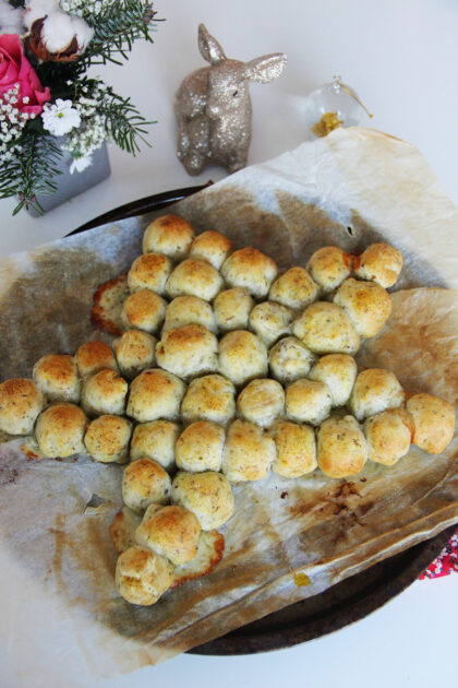 - Disposez les boules sur une plaque de cuisson recouverte de papier sulfurisé, en formant une étoile (ou un cercle si vous préférez).